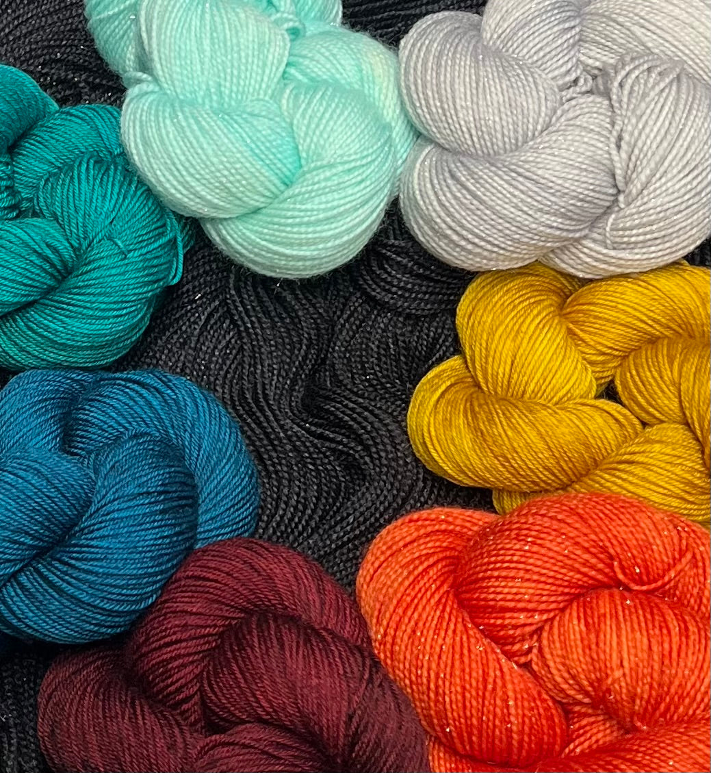 1 hank each of 7 different contrast colors in Aya 4-ply 100% Superwash Merino Fingering at 218 yards each. (50g per hank)